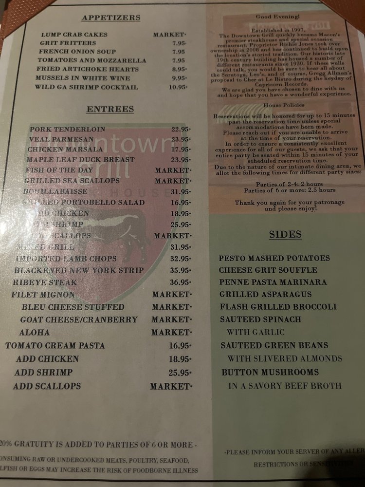 Welcome to Downtown Grill, a delightful fusion of seafood and steakhouse offerings nestled in the heart of Macon, GA. This charming eatery is renowned for its superb cuisine, exceptional service, and inviting ambiance reminiscent of an old speakeasy.